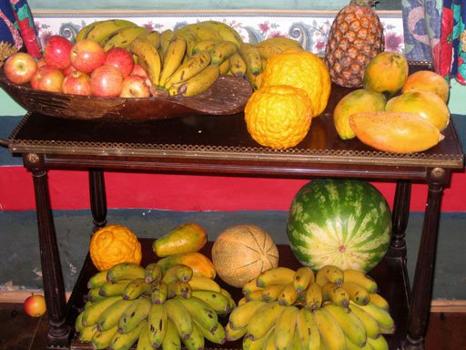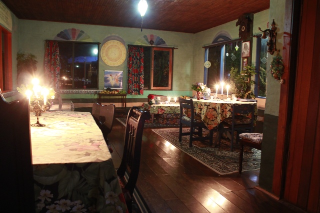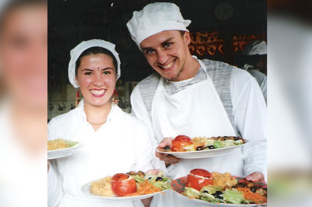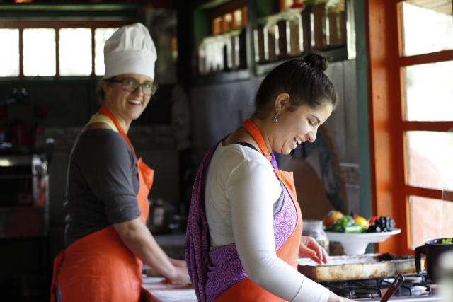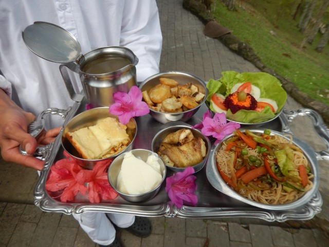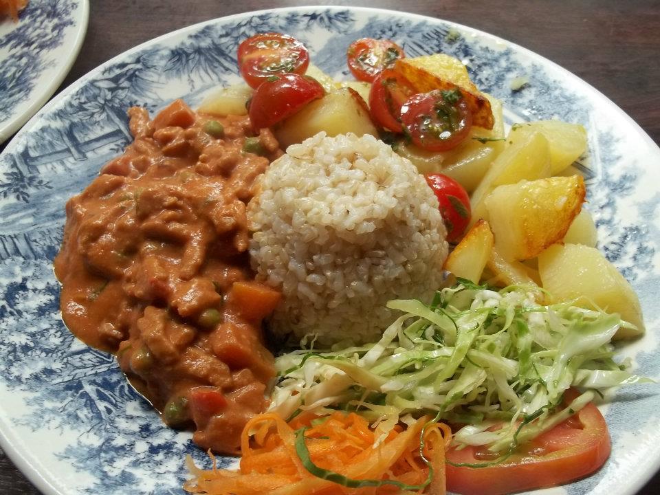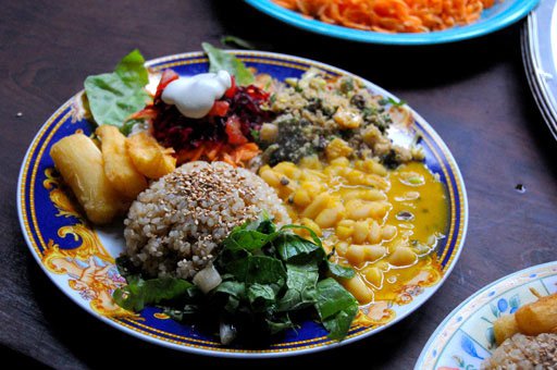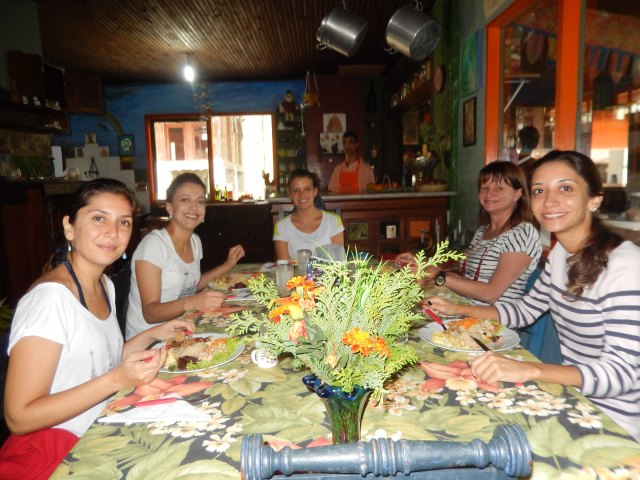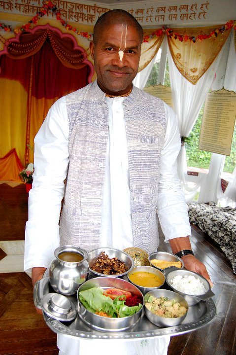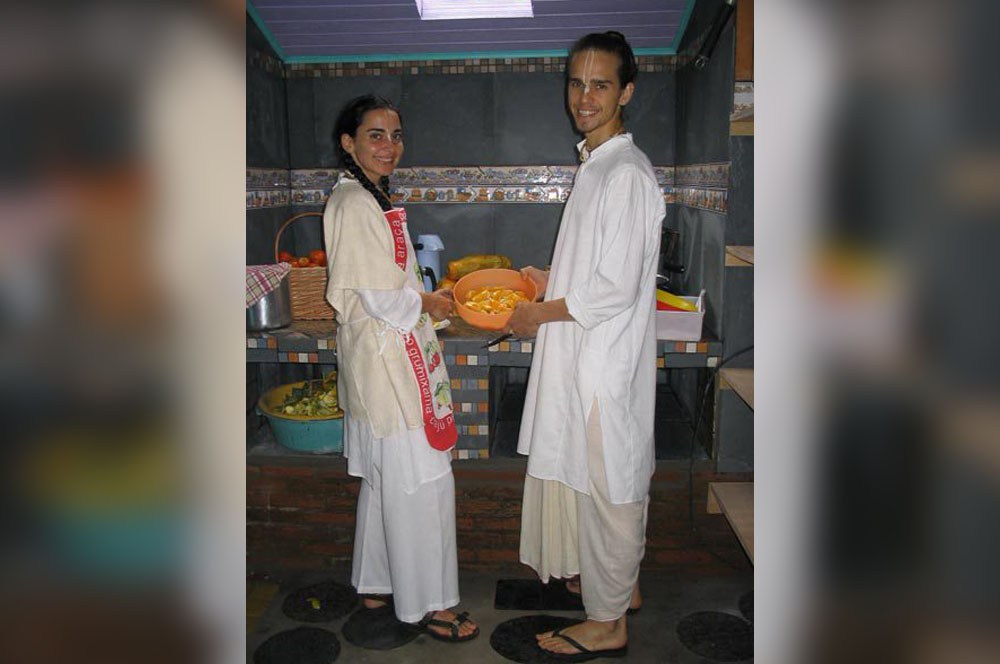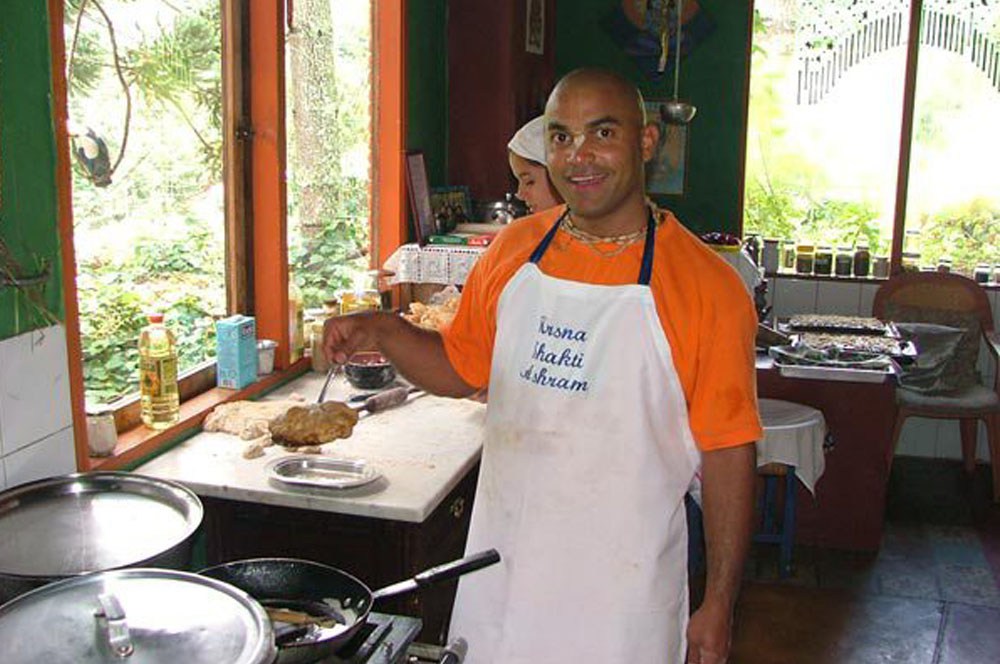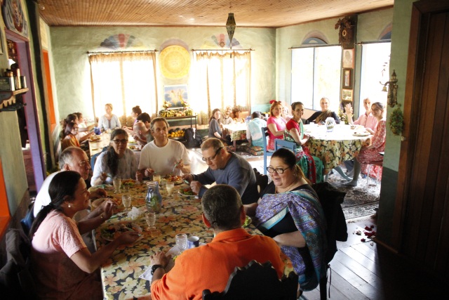 Nossa alimentação é super saudável e inspirada na culinária da Índia. Comemos cereais de todos os tipos, leite e seus derivados como queijos e iogurtes, todos os tipos de legumes, frutas e hortaliças, ou seja, seguimos uma alimentação lacto-vegetariana, o que exclui carnes brancas e vermelhas, peixes e ovos. Fazemos muita festa na hora das refeições e sempre reverenciamos o alimento antes de comer. Nossa equipe de cozinha é muito serena e prepara cada refeição com todo o afeto. Usamos os alimentos como fonte de potência e equilíbrio.